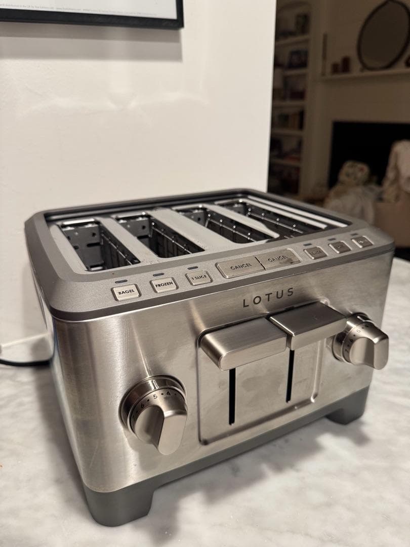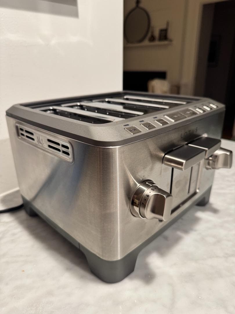 A luxurious stainless steel toaster that evenly toasts bread. With 4 wide slots to fit big bagels, texas toast etc. Its stainless steel body is gorgeous. The draw back, it's bulky, heavy and very expensive. Thank you #influenster& #thelotus for sending this great toaster for free to try and review.